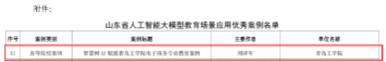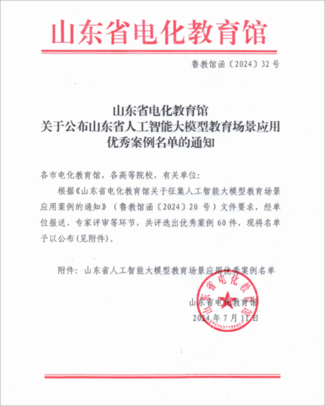 近日,山东省电化教育馆公布《山东省人工智能大模型教育场景应用优秀案例名单》,公司刘泽军老师申报的《智慧树 AI 赋能古天乐代言太阳集团电子商务专业教育案例》获批优秀案例。