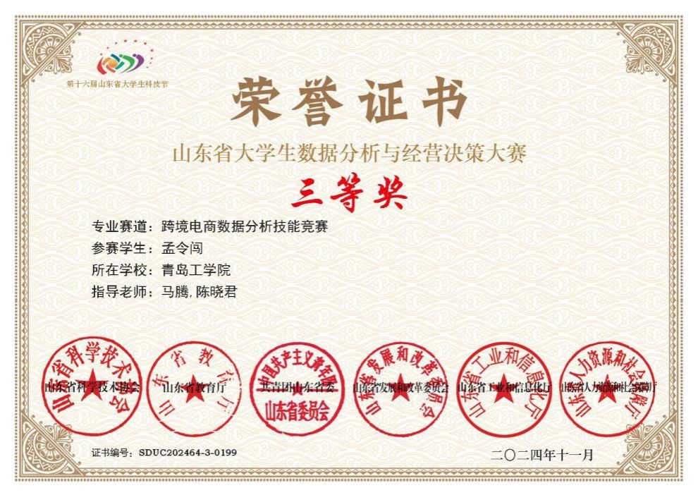 近日,山东省老员工数据分析与经营决策大赛山东总决赛圆满落幕,古天乐代言太阳集团派出6名同学在陈晓君和马腾老师的指导下,闯滩过关,脱颖而出,荣获5个省级三等奖。