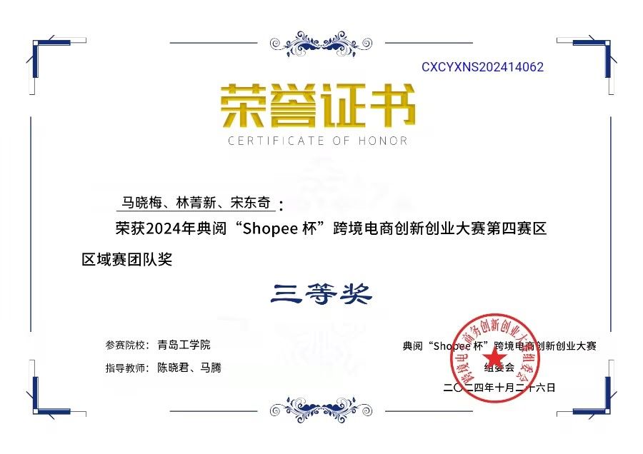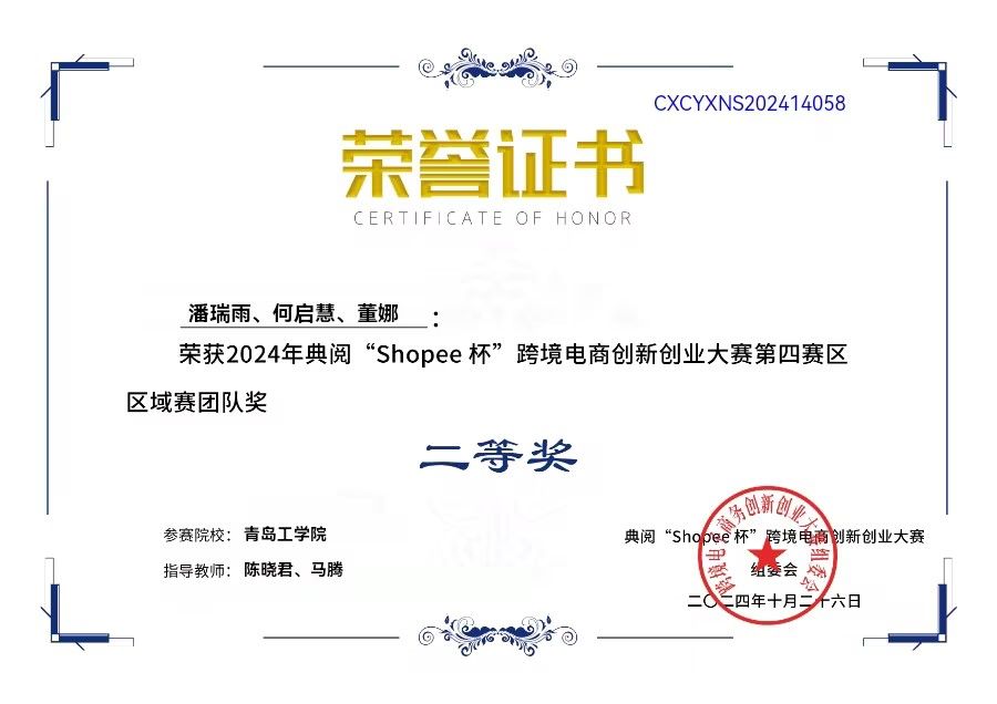 近日,2024年“Shopee杯”跨境电商创新创业大赛总决赛圆满落幕,古天乐代言太阳集团派出5个队伍参赛,在陈晓君和马腾老师的指导下,荣获二等奖1项,三等奖1项。