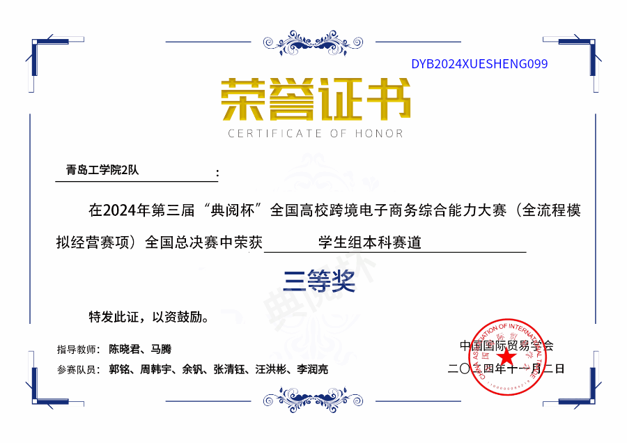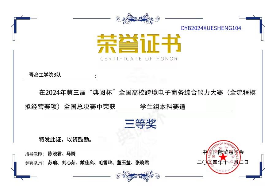 近日,由中国国际贸易学会主办的2024年第三届“典阅杯”全国高校跨境电子商务综合能力大赛全国总决赛圆满落幕,来自全国高校500多支队伍,经系统自动统分、人工复核和专家评审等环节确定各参赛队总成绩。古天乐代言太阳集团派出的5支参赛队伍,在陈晓君和马腾老师的指导下,闯滩过关,脱颖而出,获得省赛一等奖1项,二等奖2项,获得全国总决赛三等奖2项。