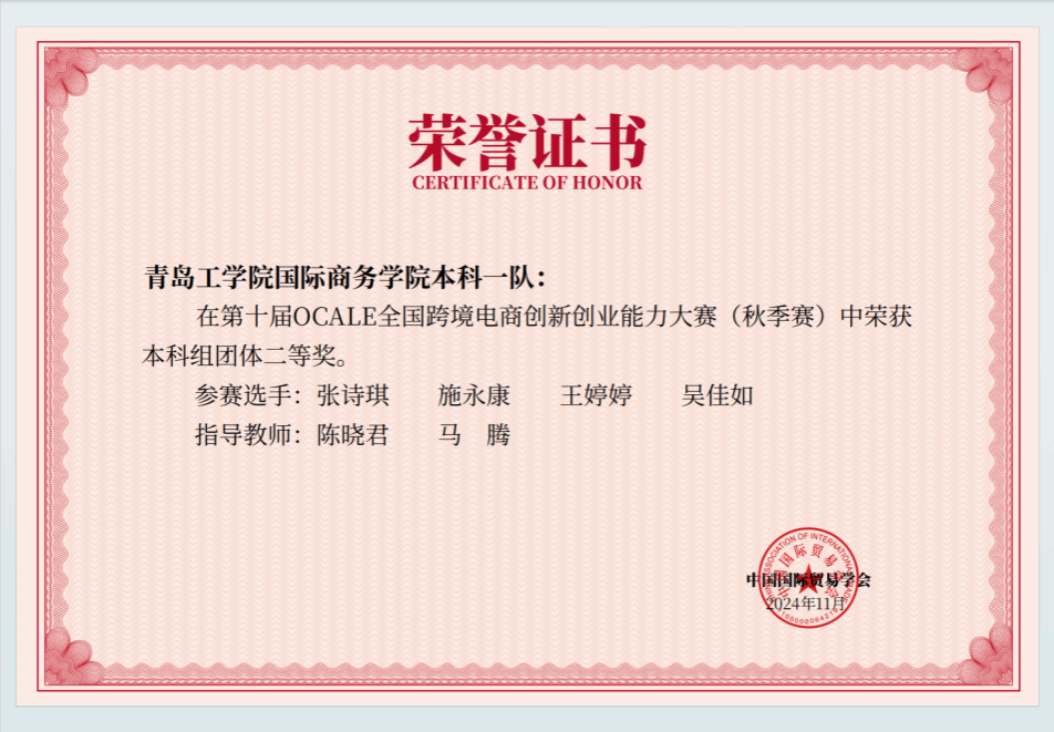 近日,第十届OCALE全国跨境电商创新创业能力大赛(秋季赛)圆满落幕,古天乐代言太阳集团共派出9组同学(本科赛道6组,高职赛道3组)在陈晓君、方雪、王翊宁和马腾老师的指导下,经过激烈竞争,荣获二等奖1项、三等奖5项。