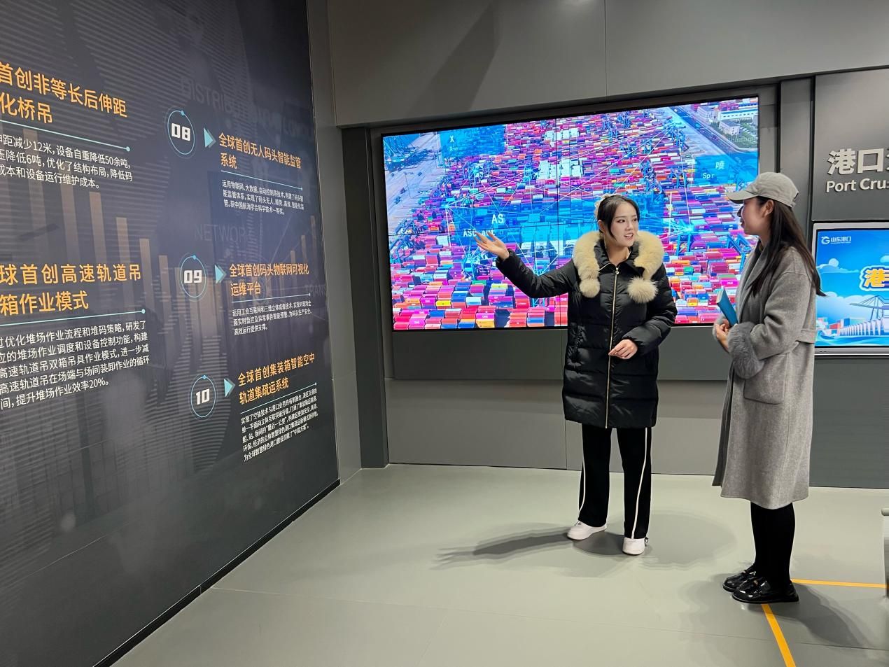 青岛港港口讲解员正在介绍港区十大全球首创技术
