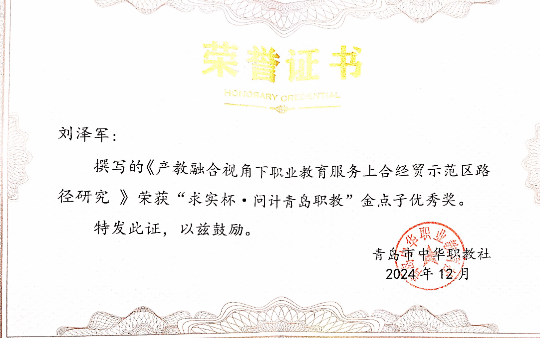 据悉,“求实杯·问计青岛职教”活动由青岛市中华职教社联合青岛统一战线智库主办,旨在发动驻青高校、职业院校、科研院所、党政机关等社会各界人士关心职教、研究职教,积极建言献策,为党委政府科学决策提供重要参考,汇聚各方智慧,为职业教育的发展出谋划策,探寻创新路径。刘泽军老师从产教融合的视角出发,深入分析了职业教育如何更好地服务于上合经贸示范区的发展,为职业教育与地方经济的深度融合提出了具有前瞻性和可操作性的建议。