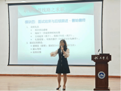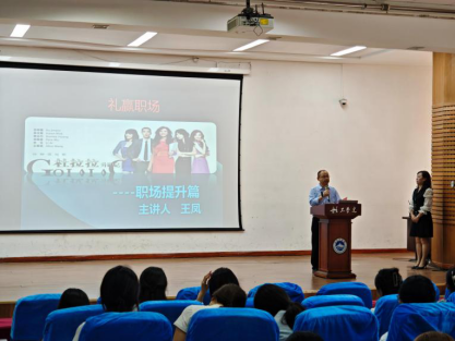 王凤作为国家注册二级心理咨询师、人力资源管理师及职业生涯规划指导师,在创新创业、职场赋能等领域拥有深厚积淀。讲座中,王凤以“职场提升篇”为切入点,围绕“礼仪的首因效应”展开论述。她结合其丰富的实战经验,围绕职场礼仪、高效沟通、形象管理以及职业素养等核心议题,为同学们带来了一场知识与实践并重的精彩分享。她强调,职场礼仪不仅是个人形象的展现,更是职场竞争力的关键要素。