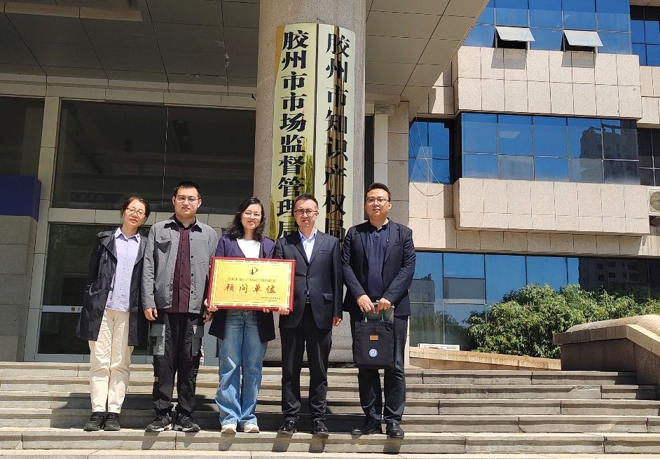 集团一行5人手持顾问单位牌匾在市场监管局门前合影