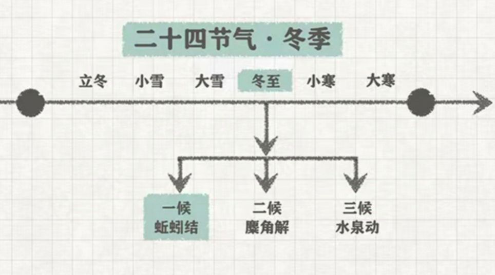 中国古代一些文学作品将冬至分为三候:“一候蚯蚓结;二候麋角解;三候水泉动。”意思是土中的蚯蚓仍然蜷缩着身体,麋感阴气渐退而解角。由于冬至后太阳直射点往北回返,太阳往返运动进入新的循环,太阳高度自此回升、白昼逐日增长,所以此时山中的泉水可以流动并且温热。