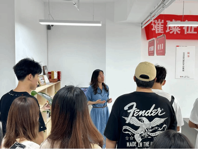 活动中,同学们在HR总监余晓妍带领下参观办公区域及核心部门。她结合工作场景,讲解企业“勤奋、担当、真诚、高效、创新”的价值观和“快乐工作,追求精神与物质满足”的理念,强调以“解放老板”为使命,从高端猎聘拓展至全链条人才服务,秉持“成为全球最受信赖的人力资源伙伴”愿景,使同学们深刻感受企业温度。