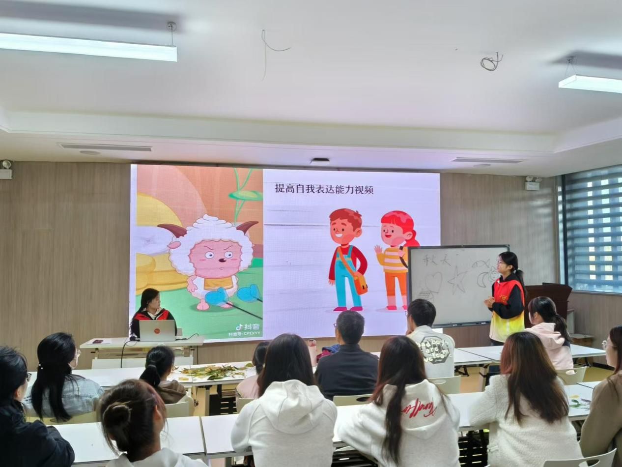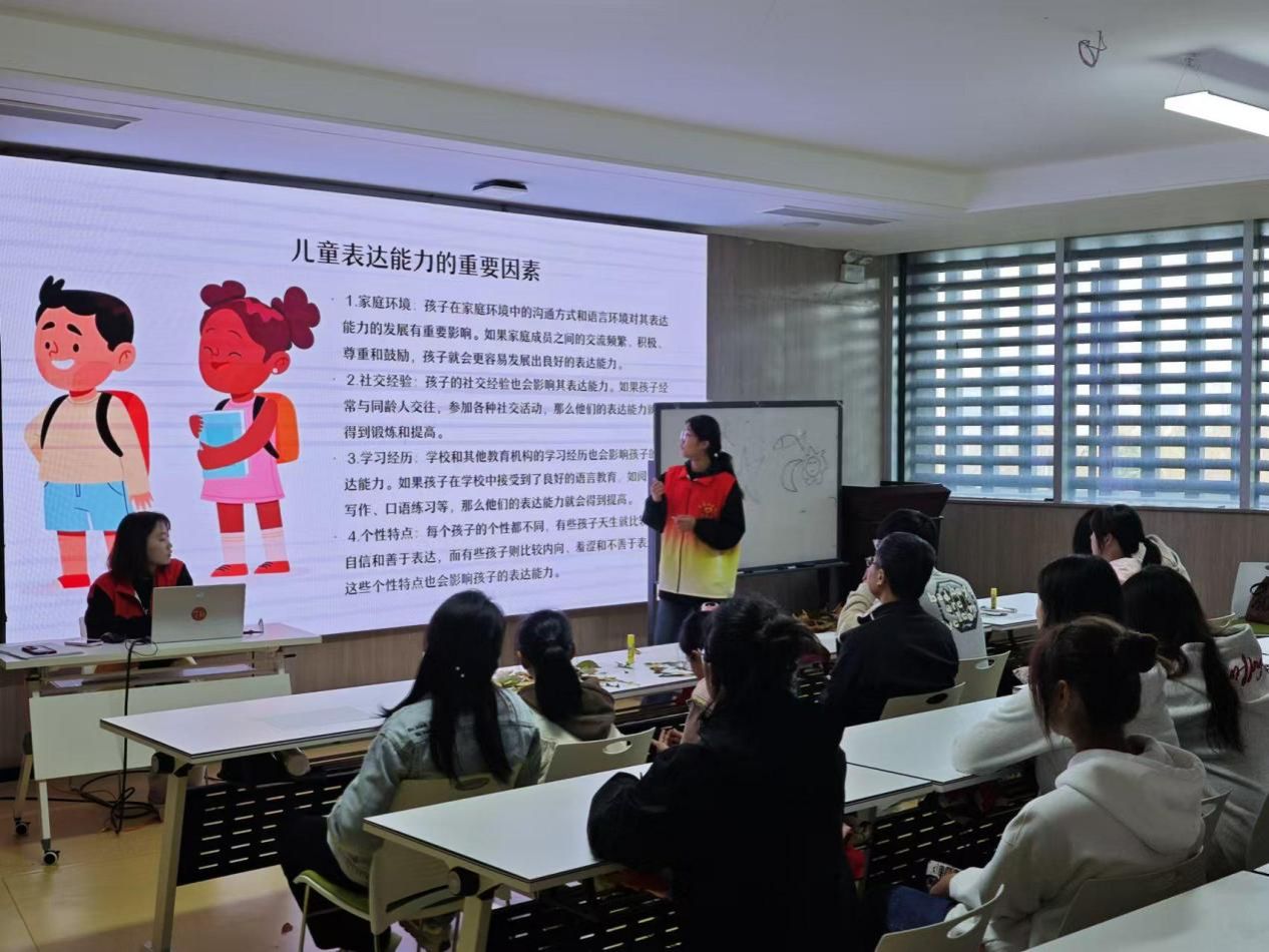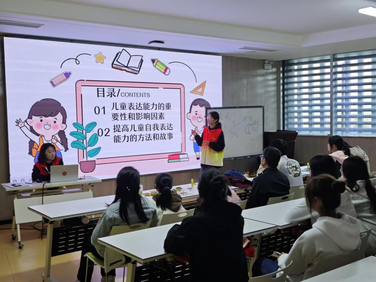 志愿者们精心备课、认真授课,为孩子们打造了一个专属的趣味世界。在这里,儿童不再是羞涩的小花朵,而是被鼓励着大胆绽放的精灵。志愿者们利用主题宣讲的形式,由主讲人李子轩先向家长朋友们讲述了提高儿童表达能力的重要性以及方法。
