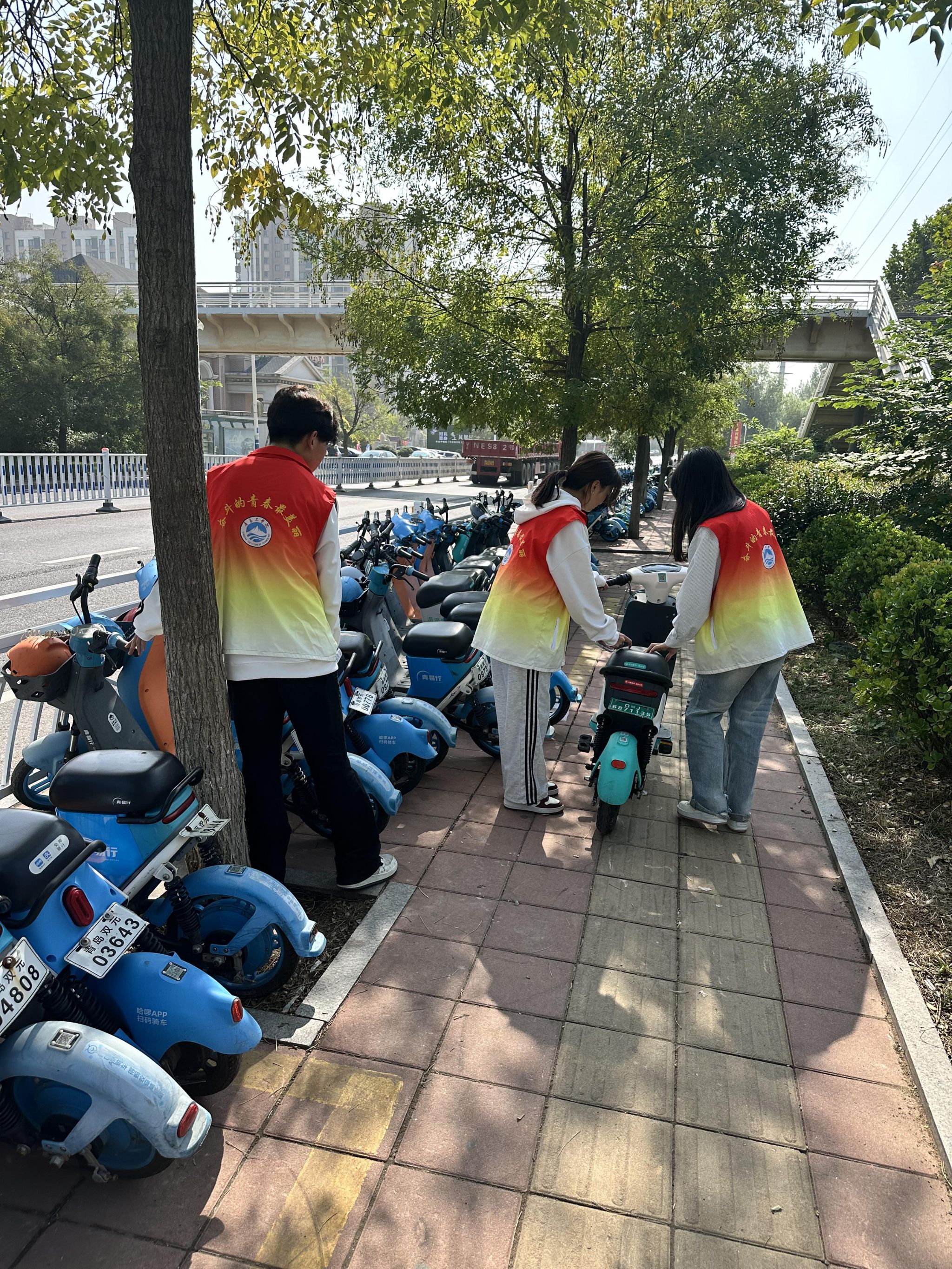 志愿者们对乱停乱放乱靠的共享单车进行清理、归位,通过积极整治确保车辆停放整齐有序。
