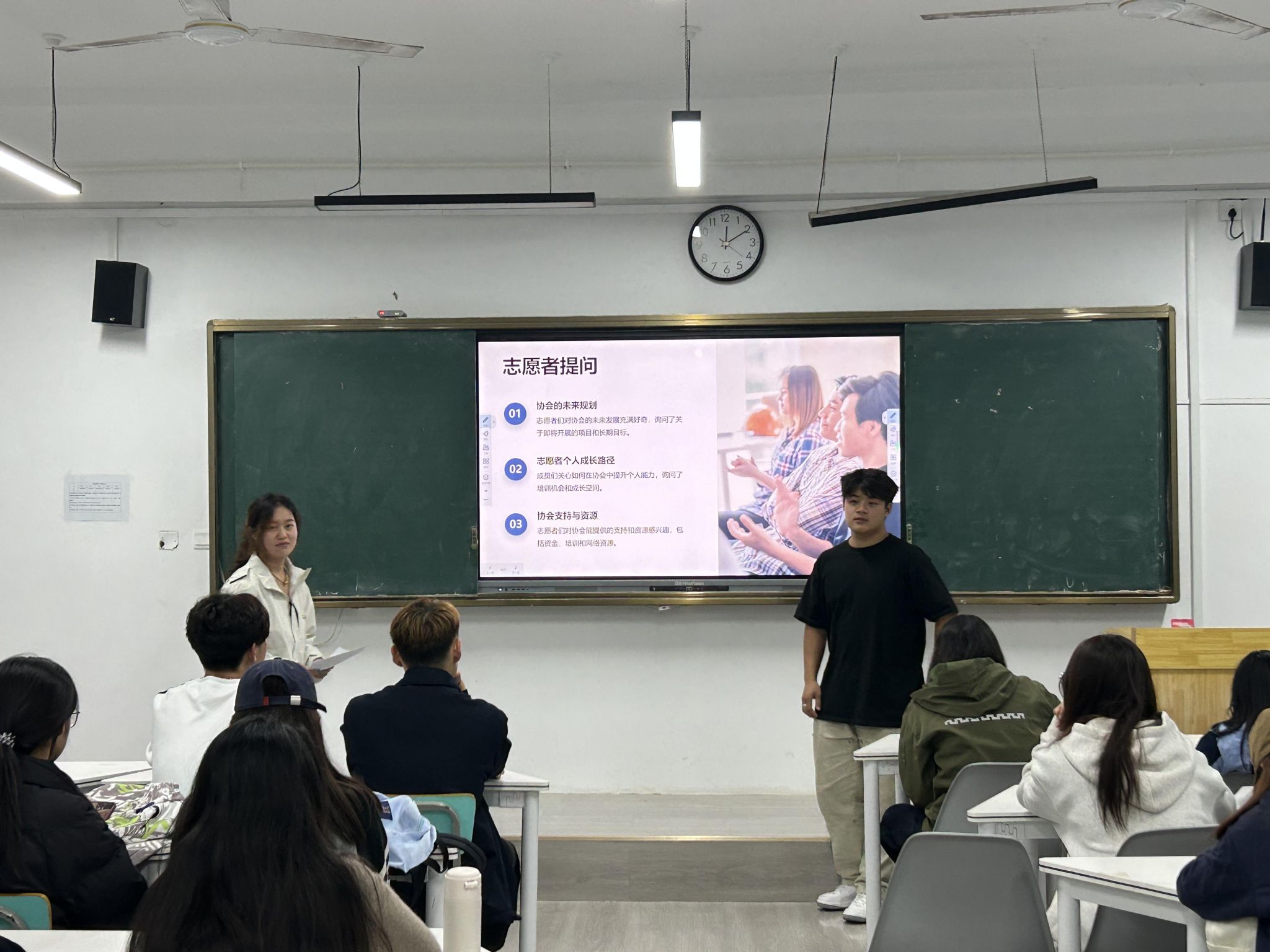 紧接着会长张景馨着重阐述了志愿服务计划、对志愿者的工作要求以及志愿申报表的,希望志愿者们能够以积极的工作态度、强烈的责任心和无私的团队精神,迎接工作中的挑战和压力。员工会服务部两位部长金秋全、李玉慧分别对志愿者的提问进行解答、对志愿服务进行简单有效地培训。