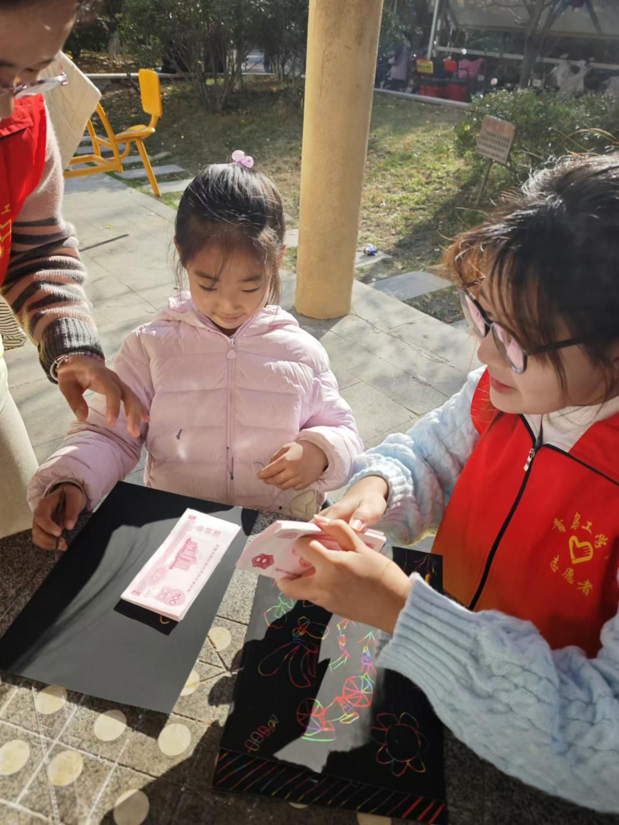 志愿者们依托专业特长,围绕社区,雕琢出独树一帜的志愿服务篇章,聚焦“点钞”技艺,深植财商教育。志愿者们从点钞基础切入财商启蒙,讲述货币流通、储蓄意义,以通俗话术拆解复杂金融术语;模拟银行场景,教孩子分辨假币、规划零花钱,助力成年人理解理财门道。